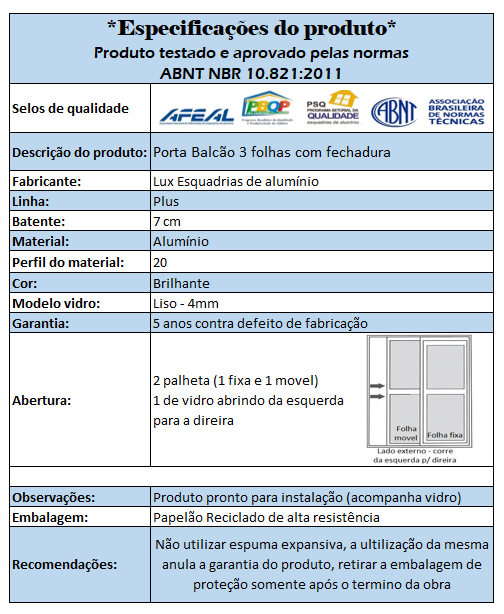 Porta Balcão perfectra max 3 folhas - aluminio Branco ou preto